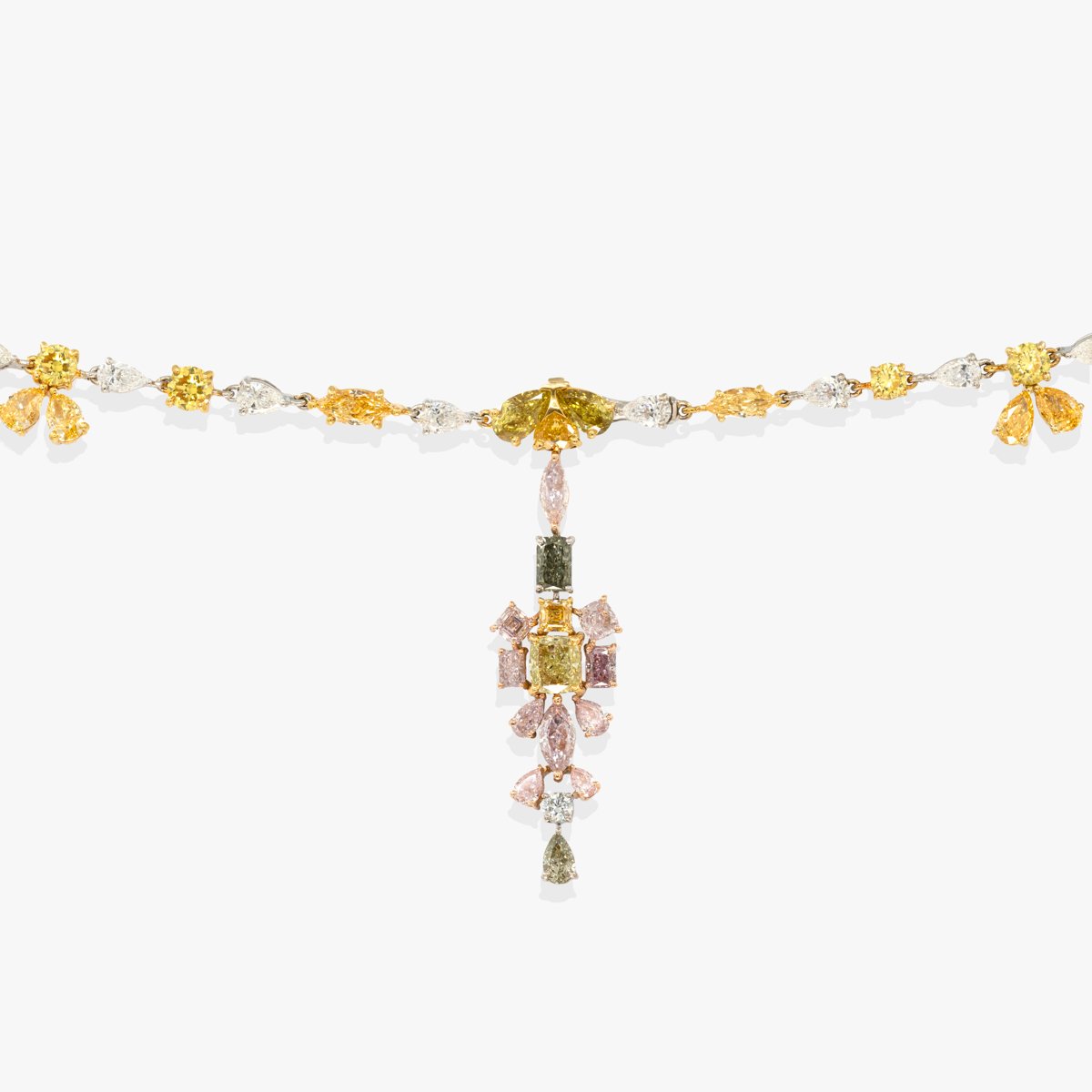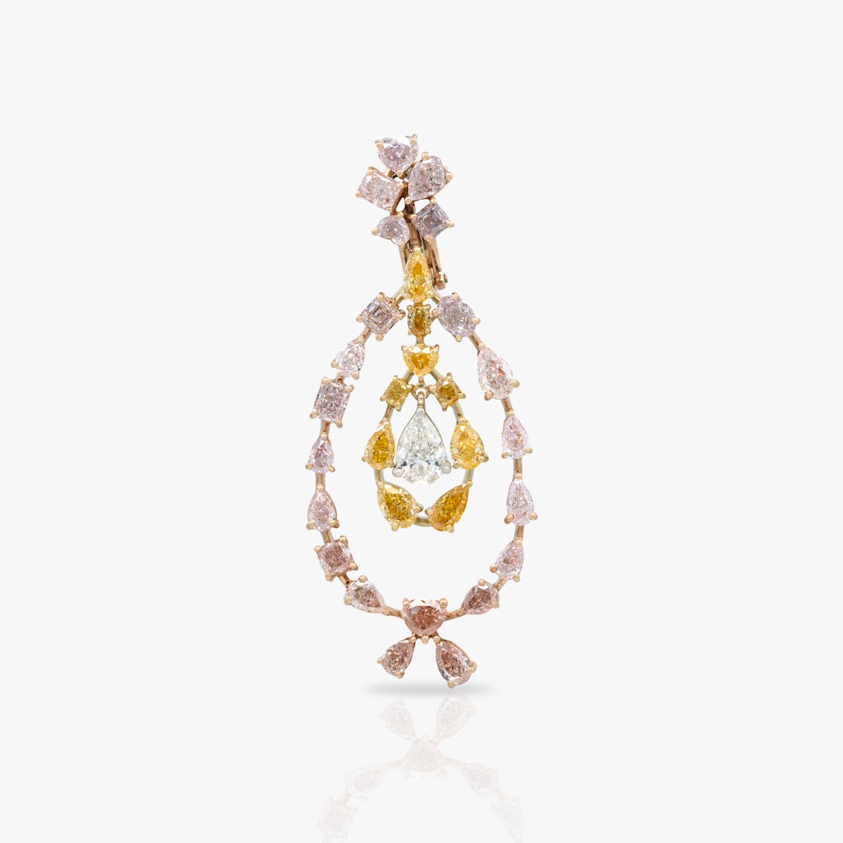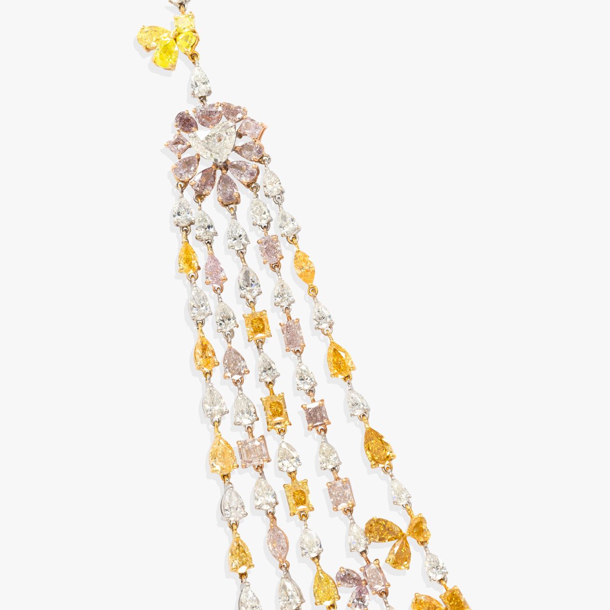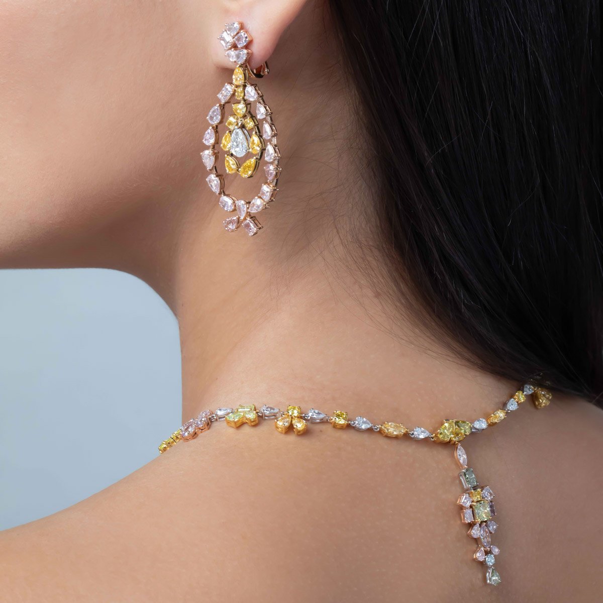 A stunning high jewellery set featuring rare colored natural diamonds in pink, yellow, and white. This set showcases a variety of diamond cuts, including marquise, heart, pear, cushion, and trilliant, along with emerald-cut diamonds. Each diamond above 0.3 carats is GIA Certified, ensuring the highest quality with F-H colors and VS+ clarity.