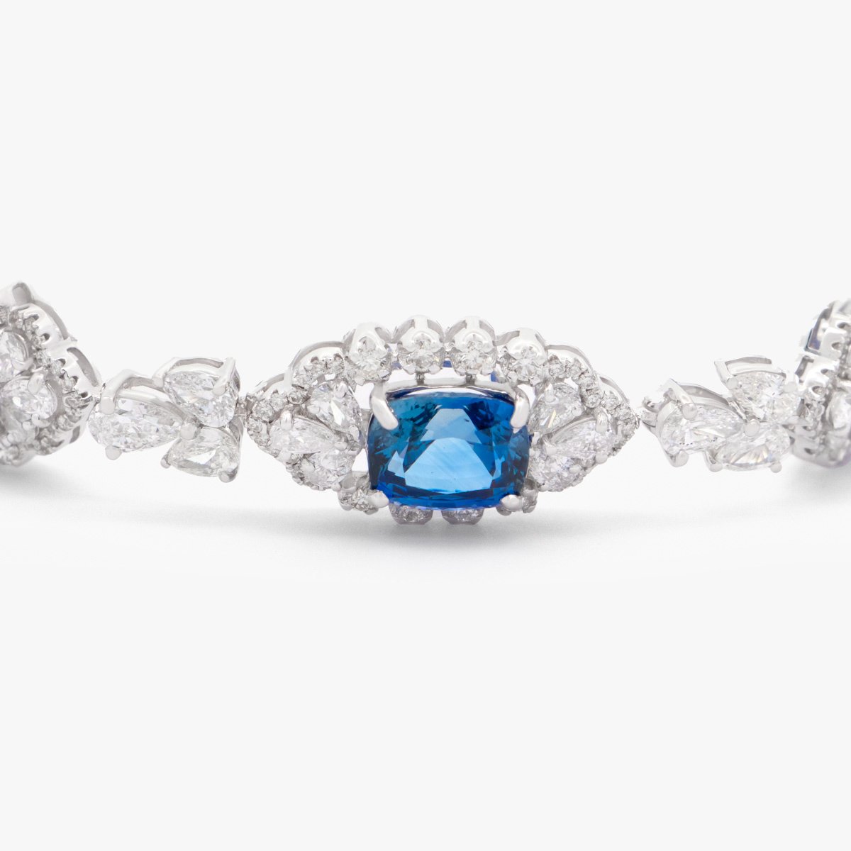 A high jewellery set adorned with majestic blue sapphires and natural diamonds. This versatile set transforms from a tiara to a necklace, with marquise diamonds and cushion-cut sapphires shimmering like stars in the night sky. Each diamond above 0.3 carats is GIA Certified, with F-H colors and VS+ clarity, making this set a symbol of royalty and luxury.