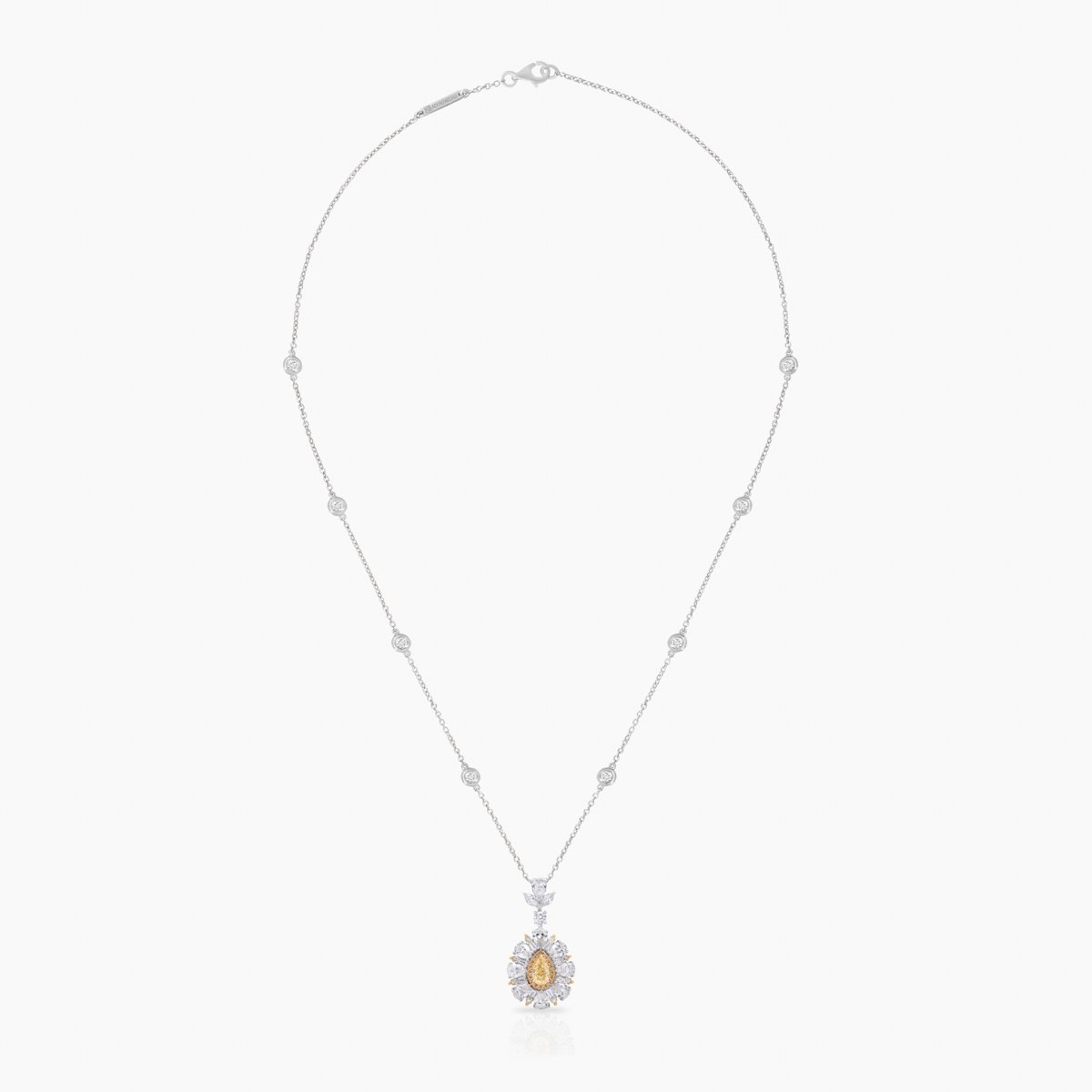 A fancy yellow pear-shaped center diamond, surrounded by a total of 3.85 carats of natural yellow and white diamonds. Each diamond is meticulously selected for its superior quality, making this piece a radiant display of elegance.