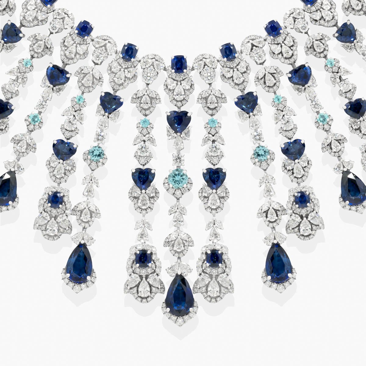 An epitome of luxury, featuring a magnificent blend of Paraiba tourmaline, blue sapphires, and white diamonds. This exquisite piece is meticulously crafted to create a harmonious blend of brilliance and sophistication.