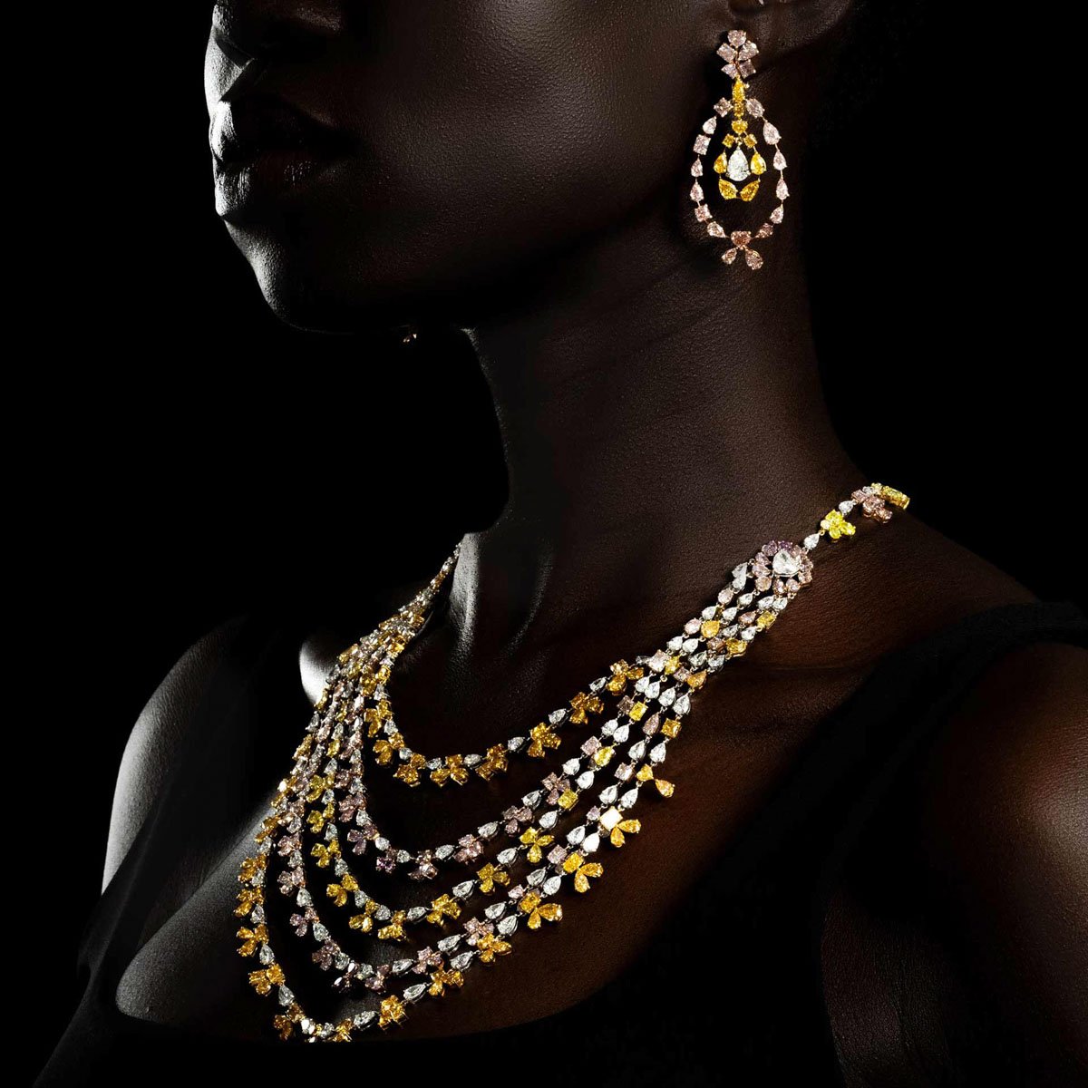 Featuring rare natural diamonds in pink, yellow, and white, with marquise, heart, pear, cushion, trilliant, and emerald cuts. This vibrant piece is a celebration of color and elegance, perfect for making a bold statement.