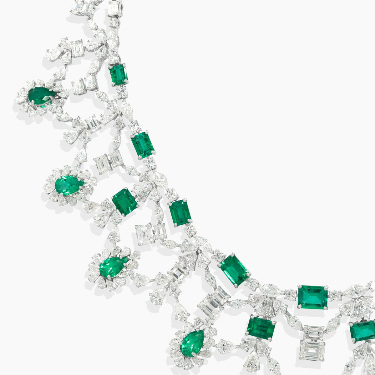 At the heart of this breathtaking necklace are vibrant green emeralds, set in pear and emerald cuts, surrounded by dazzling diamonds. This necklace evokes the beauty of nature, blending the brilliance of diamonds with the rich color of emeralds.