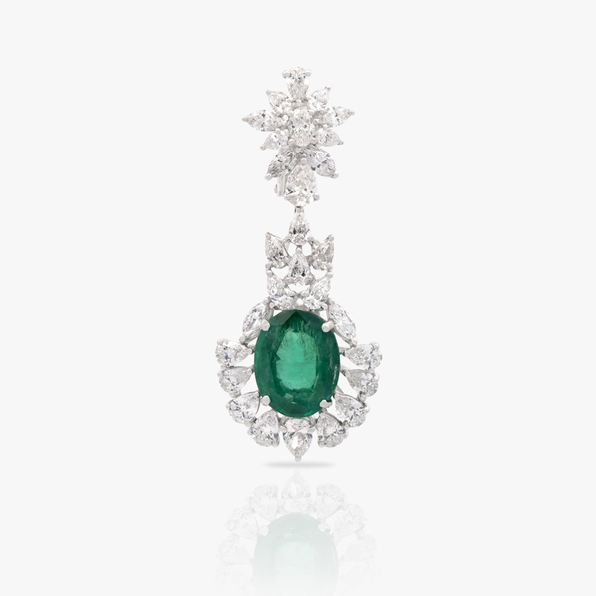 The Emerald Cascade Chandelier Earrings feature green emeralds at the center and end, surrounded by pear and marquise-shaped white diamonds. These earrings are a breathtaking display of elegance.