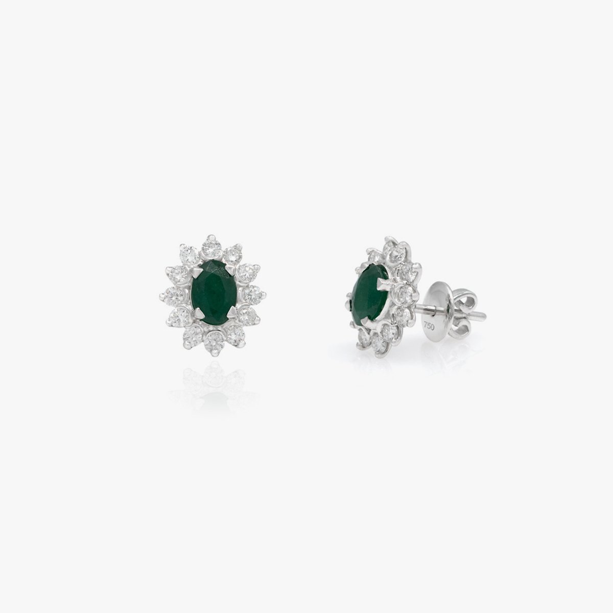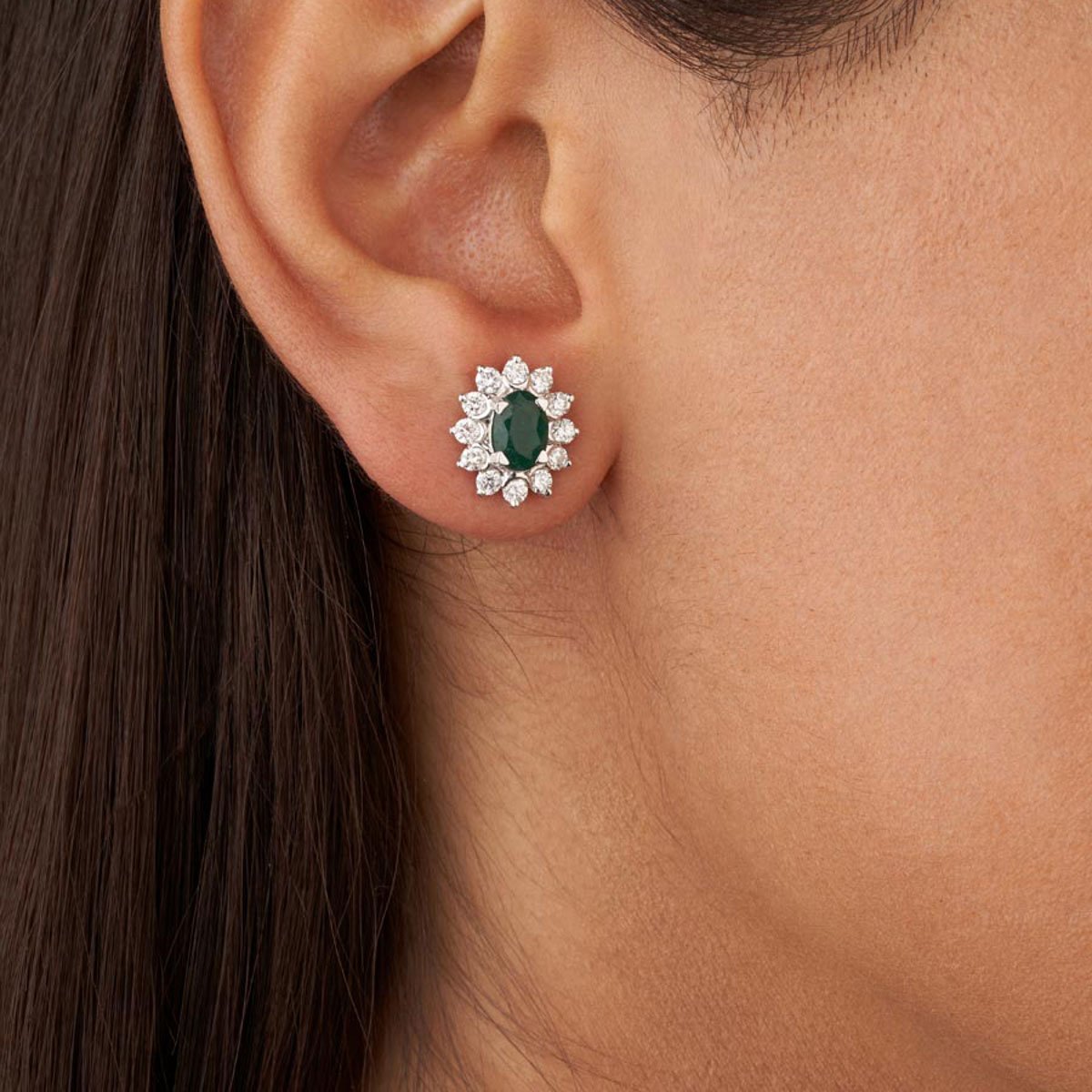 Feature an oval-shaped green emerald at the center, surrounded by round-shaped white diamonds. These earrings embody the lush beauty of emeralds, making them a perfect accessory for any occasion.