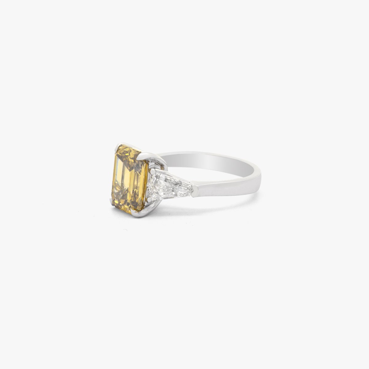 An olive-yellow diamond in an emerald cut, flanked by shield-cut diamonds, offering a unique and radiant appeal.