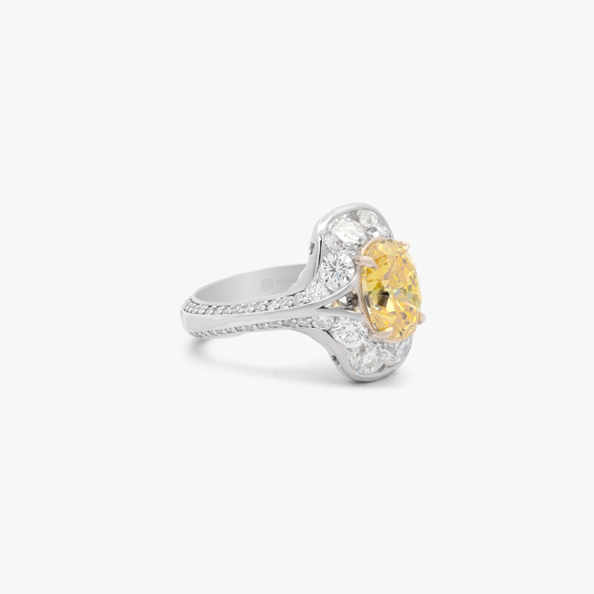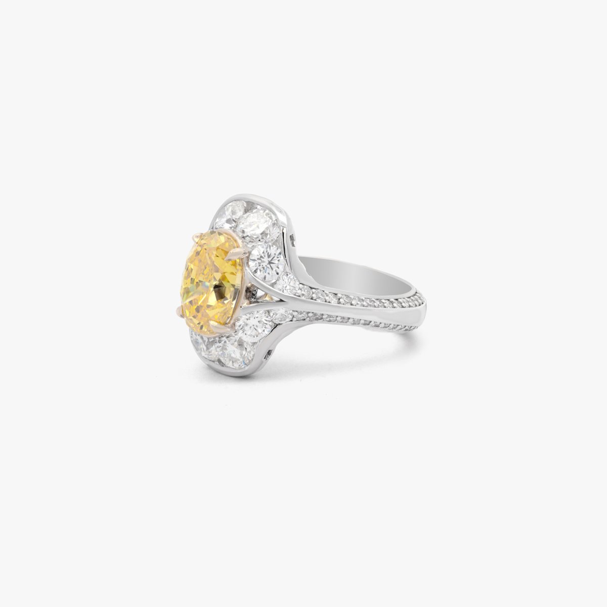An oval-cut yellow diamond, encircled by round diamonds on a pave band, exuding brilliance and warmth.