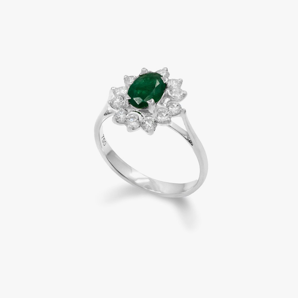A green emerald oval center, surrounded by round diamonds, for a bold and brilliant statement piece.