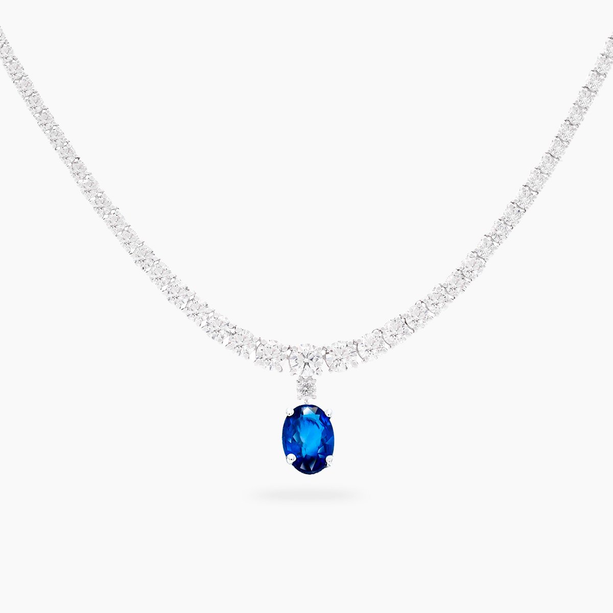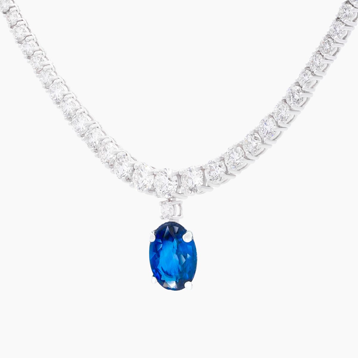 Features a breathtaking blue sapphire gemstone attachment, adding a serene and captivating element to the classic design. The rich blue sapphire complements the sparkling GIA-certified natural diamonds, creating a necklace that exudes elegance and timeless beauty.