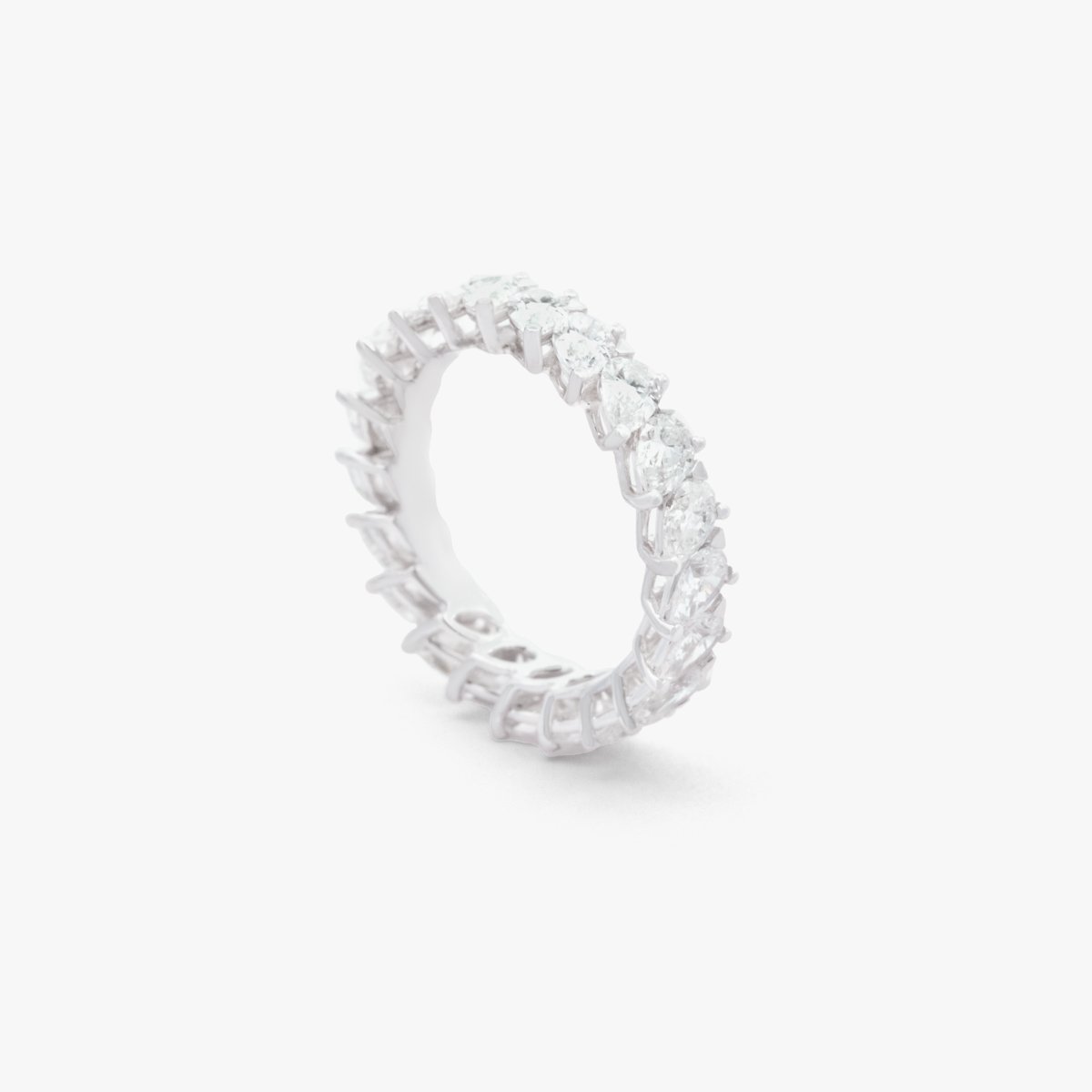 Delicate yet full of presence, the Whispering Pear Band is a poetic arrangement of diagonal pear-shaped natural diamonds. Light and airy, its graceful sparkle tells a story of timeless romance in the softest whispers of brilliance.