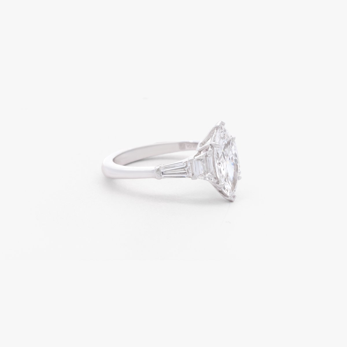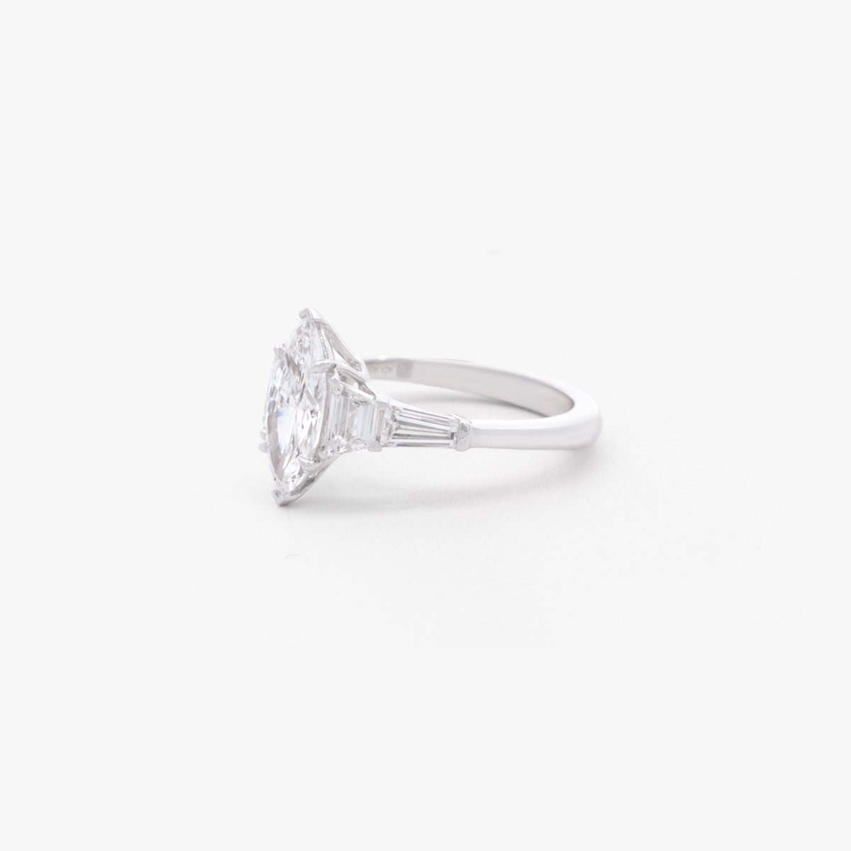 A marquise-cut center diamond flanked by two diamonds reminiscent of the Eiffel Tower, exuding Parisian charm.
