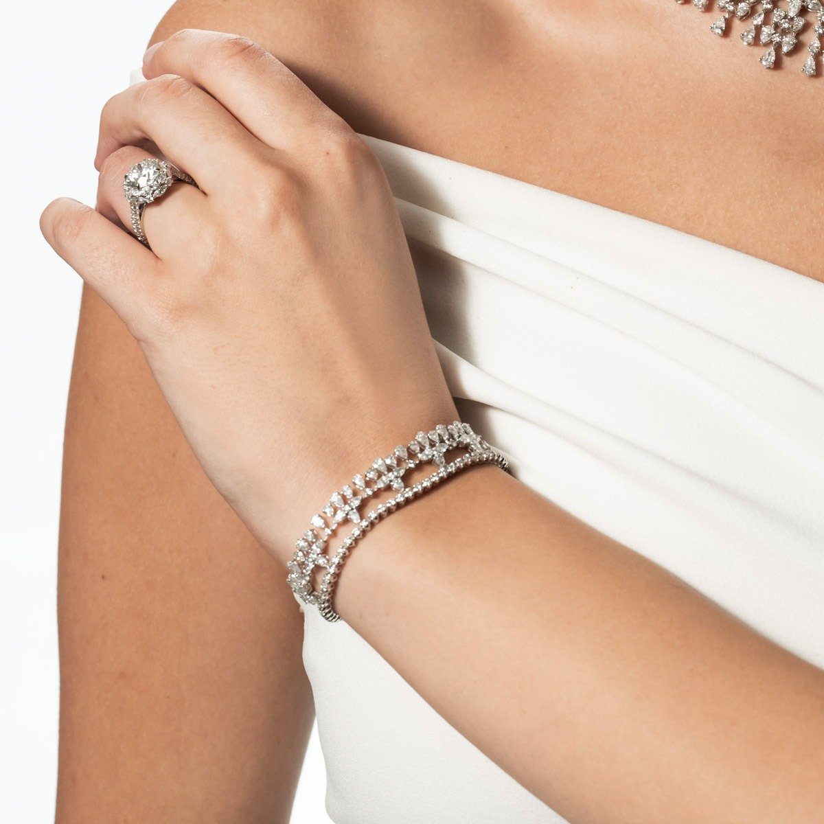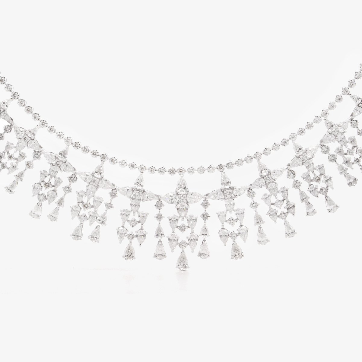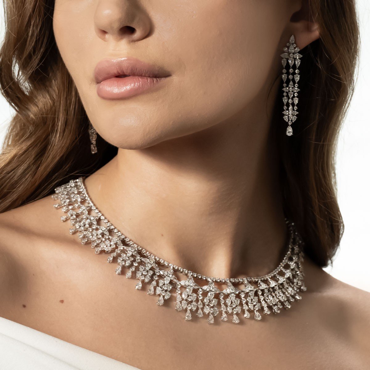 A masterpiece inspired by nature’s cascading beauty, this set features a necklace, earrings, ring, and bracelet, woven together with the brilliance of the finest natural diamonds.