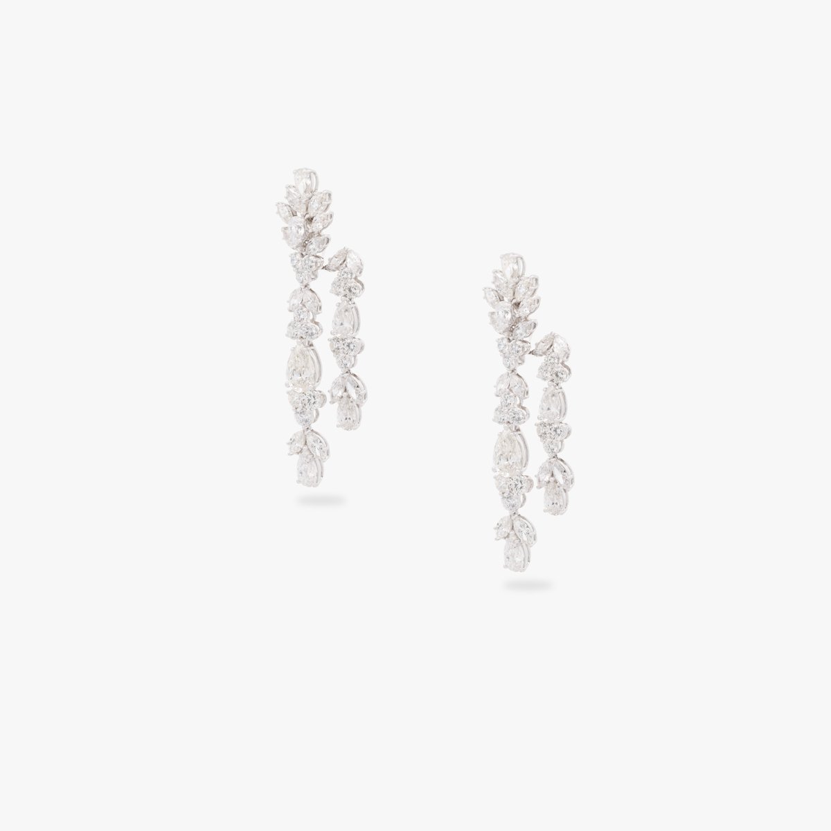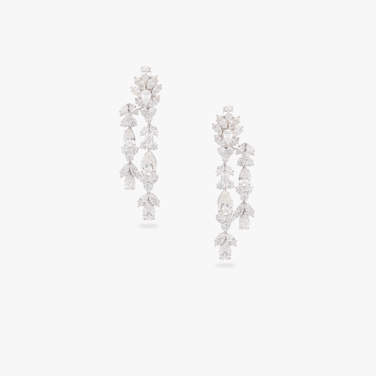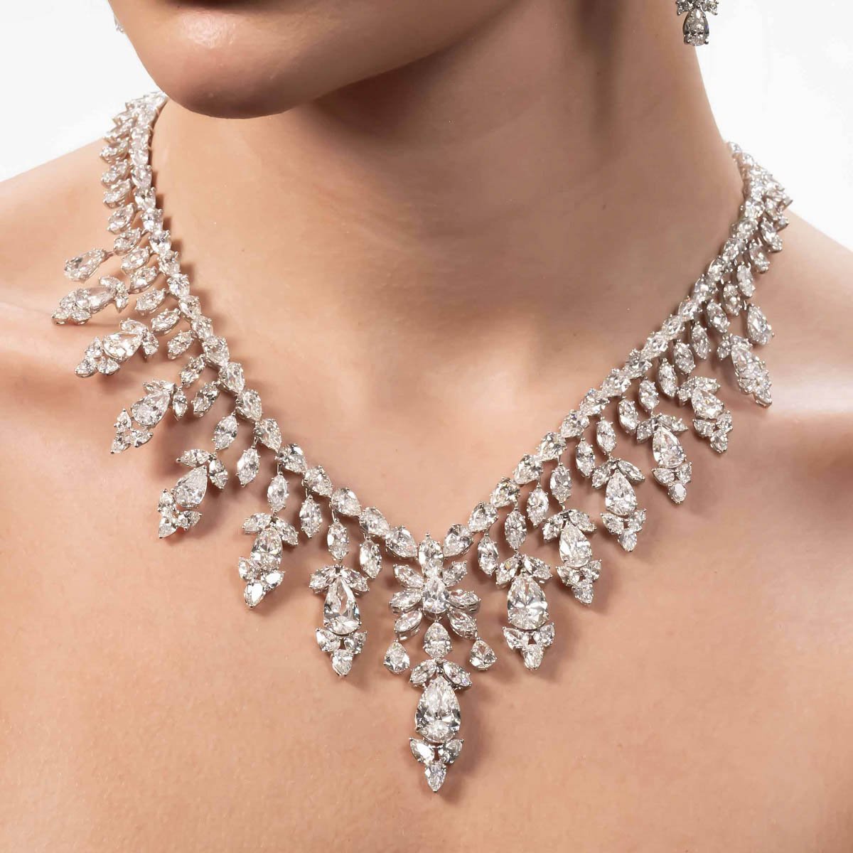 An extraordinary high-jewelry composition of large pear-shaped and marquise-cut diamonds, meticulously arranged to create one of the most opulent white diamond sets. Includes a long necklace and matching earrings.