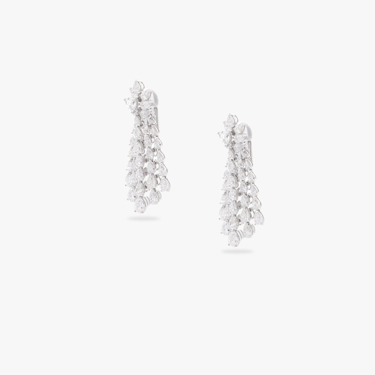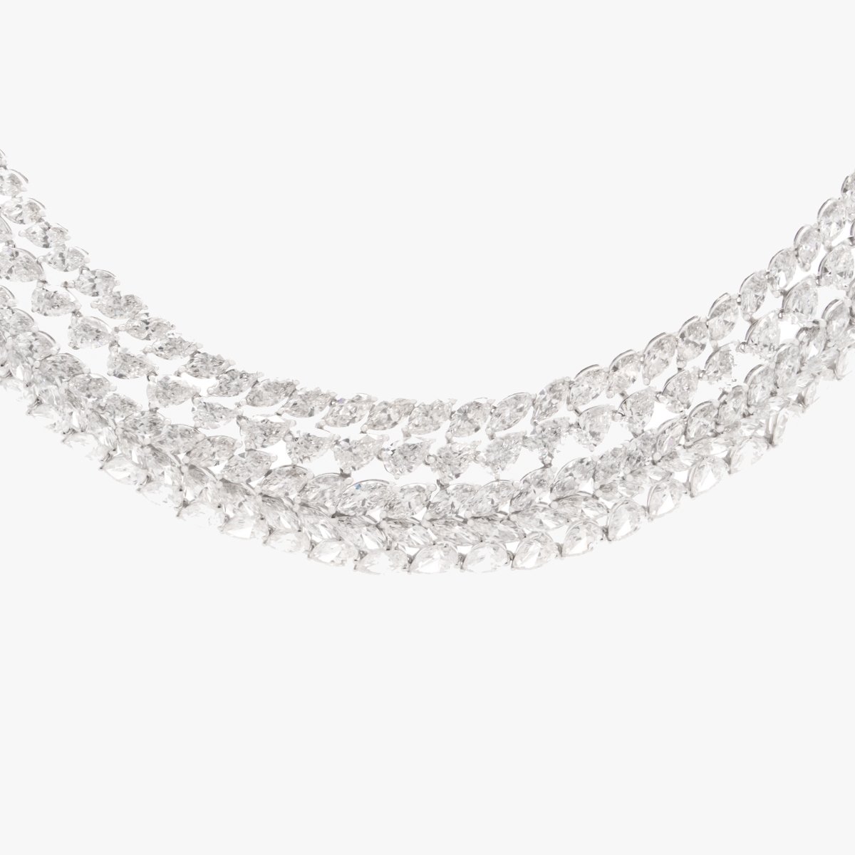 An intricate four-layered masterpiece, blending marquise and pear-shaped diamonds in a mesmerizing tennis formation, seamlessly transitioning from classic to reverse marquise, culminating in pear-shaped brilliance. Includes earrings, a necklace, and a ring.