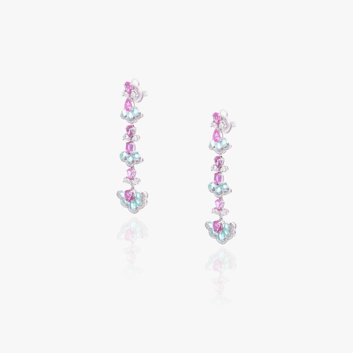 A dreamlike blend of pink sapphires and Paraiba tourmalines, accented with dazzling white diamonds in a grand and elongated design. Includes earrings and a necklace.
