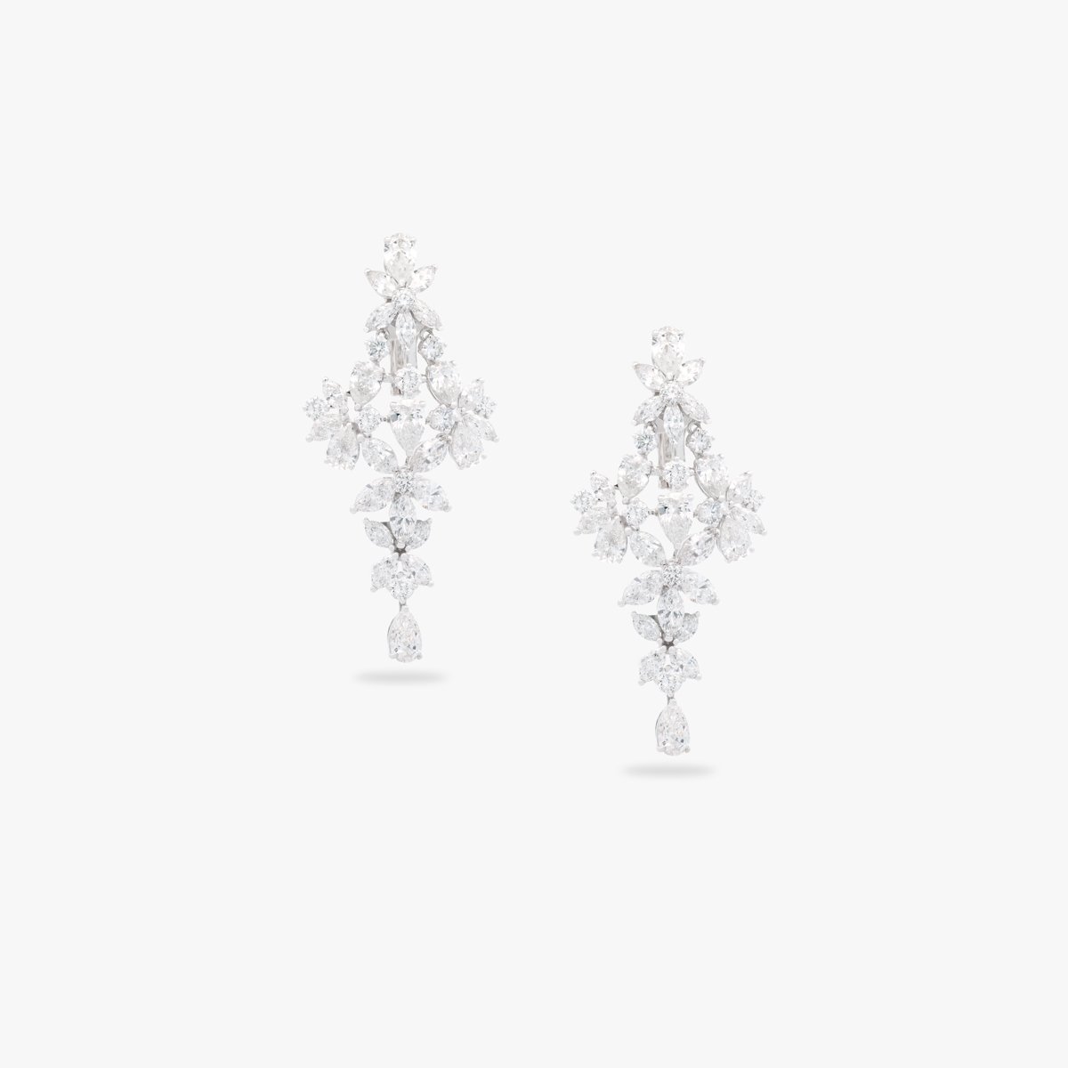 A multi-layered composition of diamonds, with pear-shaped, round, and cushion cuts, forming star-like motifs and cascading pear-shaped drops. Includes earrings and a necklace.