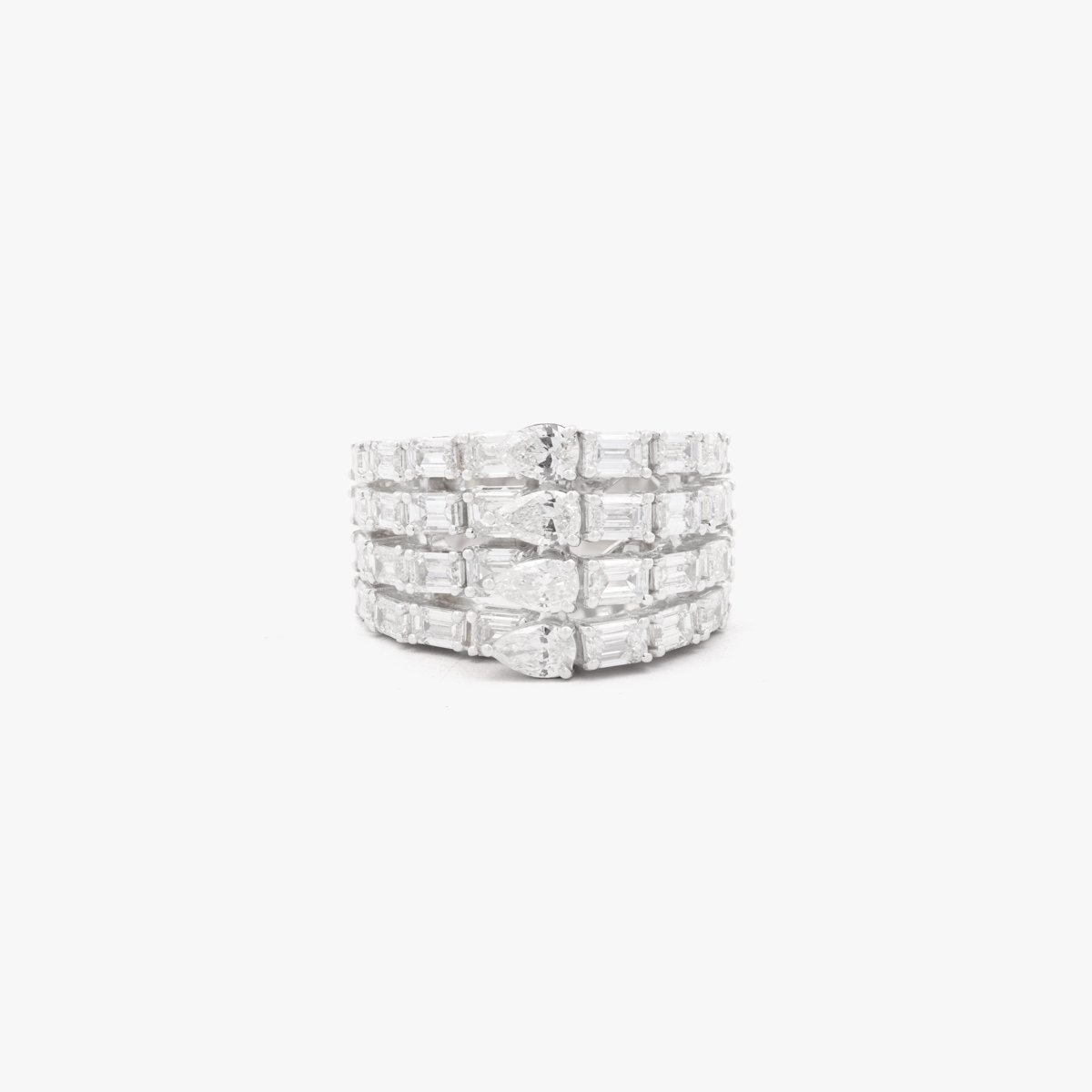 A seven-layer creation, combining emerald-cut and pear-shaped diamonds, arranged in a symphony of light and movement. Includes a necklace, earrings, and a ring.