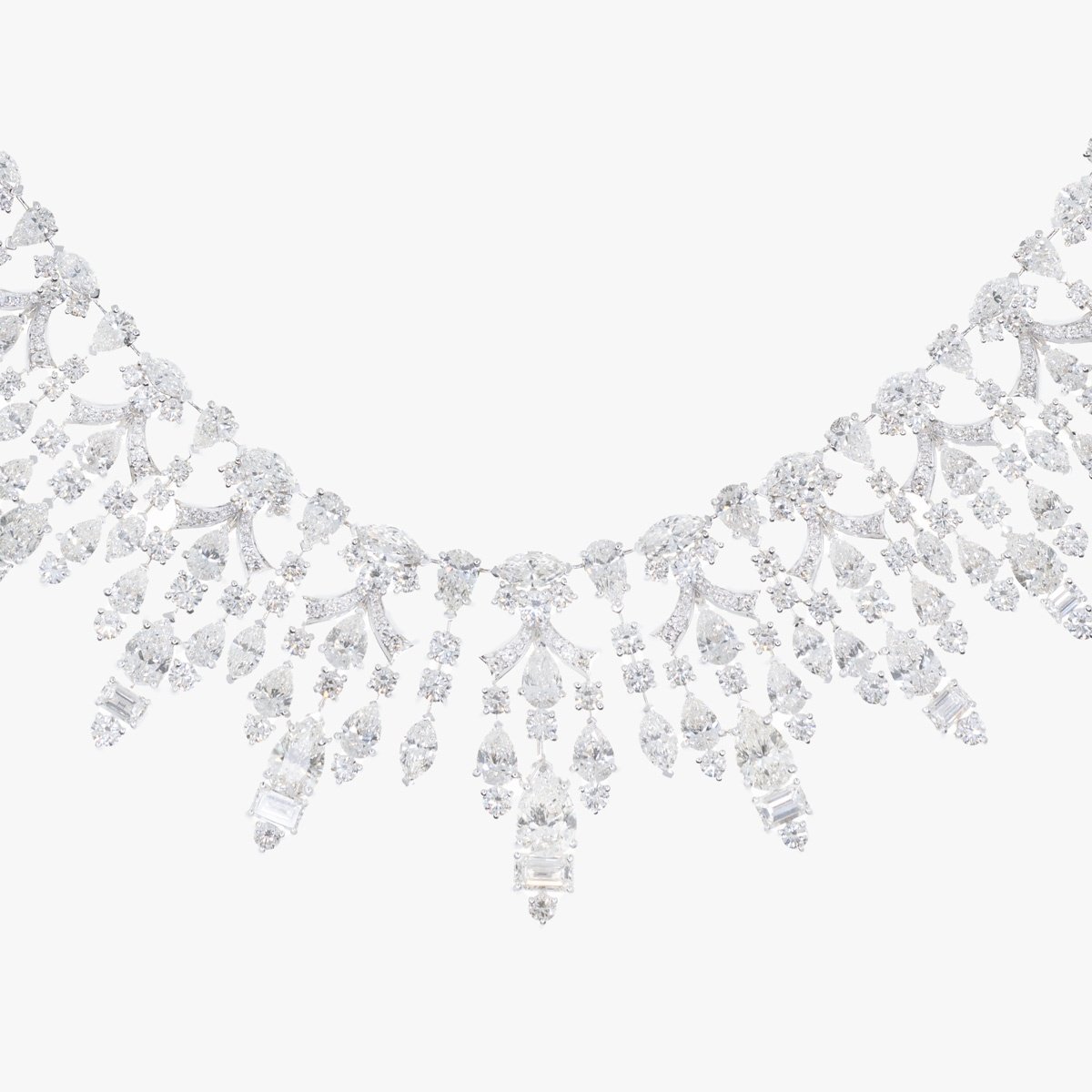A breathtaking composition of pear, baguette, emerald, cushion, and round-cut diamonds, this necklace radiates a celestial glow, embodying the essence of everlasting brilliance.