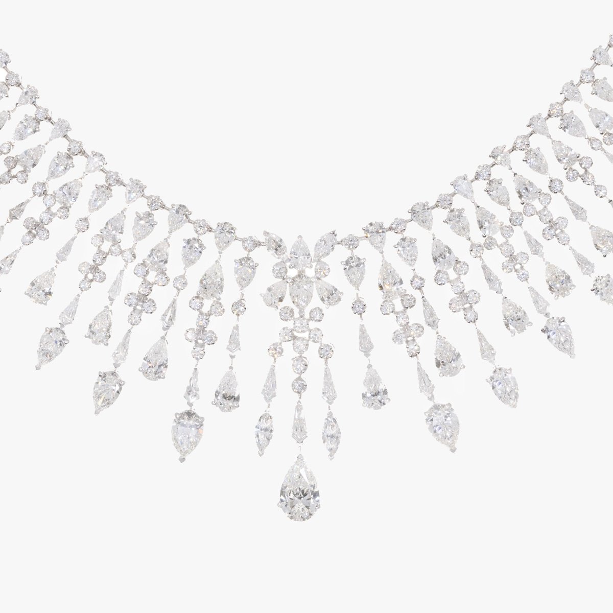 Inspired by the magic of a starlit sky, this necklace weaves pear, marquise, round, and baguette-cut diamonds into a dazzling composition. Interwoven diamonds create delicate floral patterns, evoking the beauty of celestial blooms.