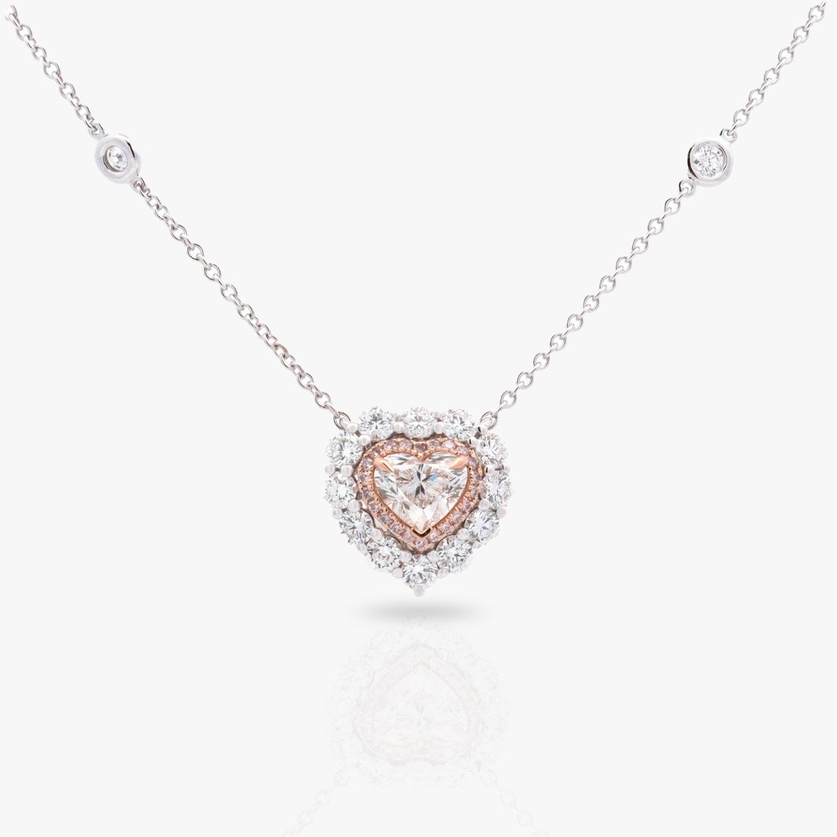 Center heart-shaped natural diamond in fine quality, GIA-certified, surrounded by pink diamonds and round side diamonds for a harmonious sparkle.