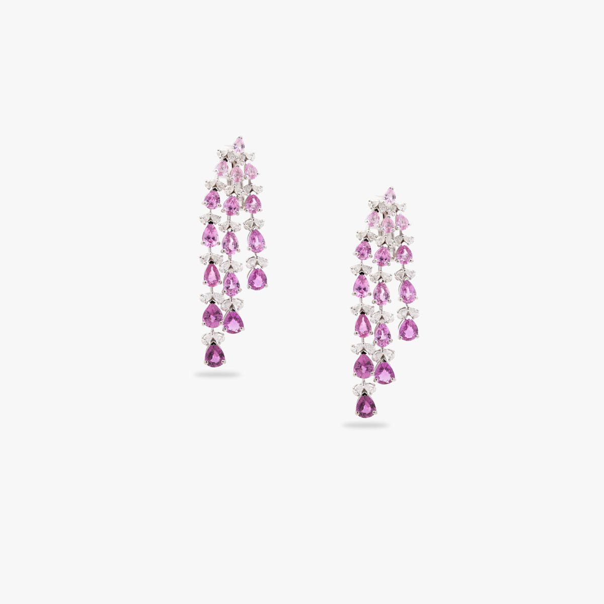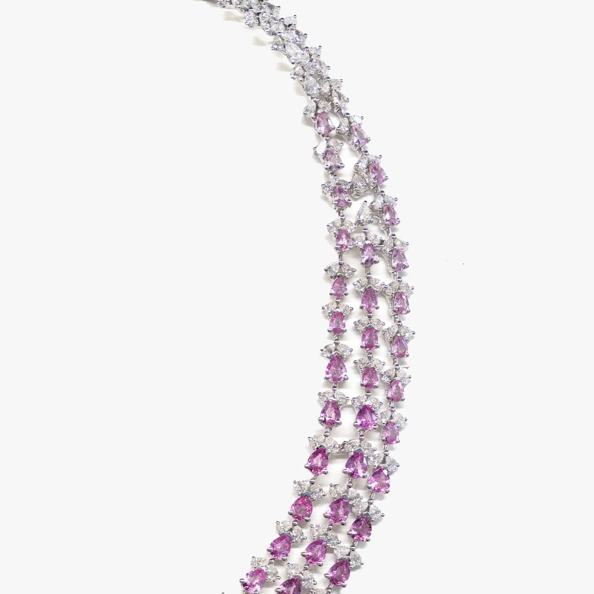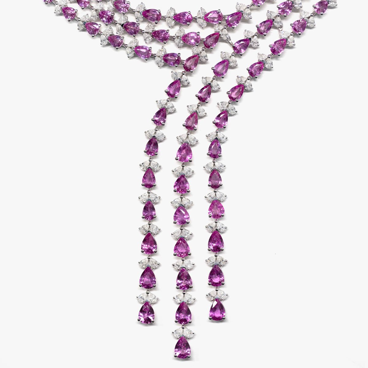 Three delicate rows of pink sapphires flow seamlessly across the necklace and earrings, creating soft, feminine, and sophisticated elegance.