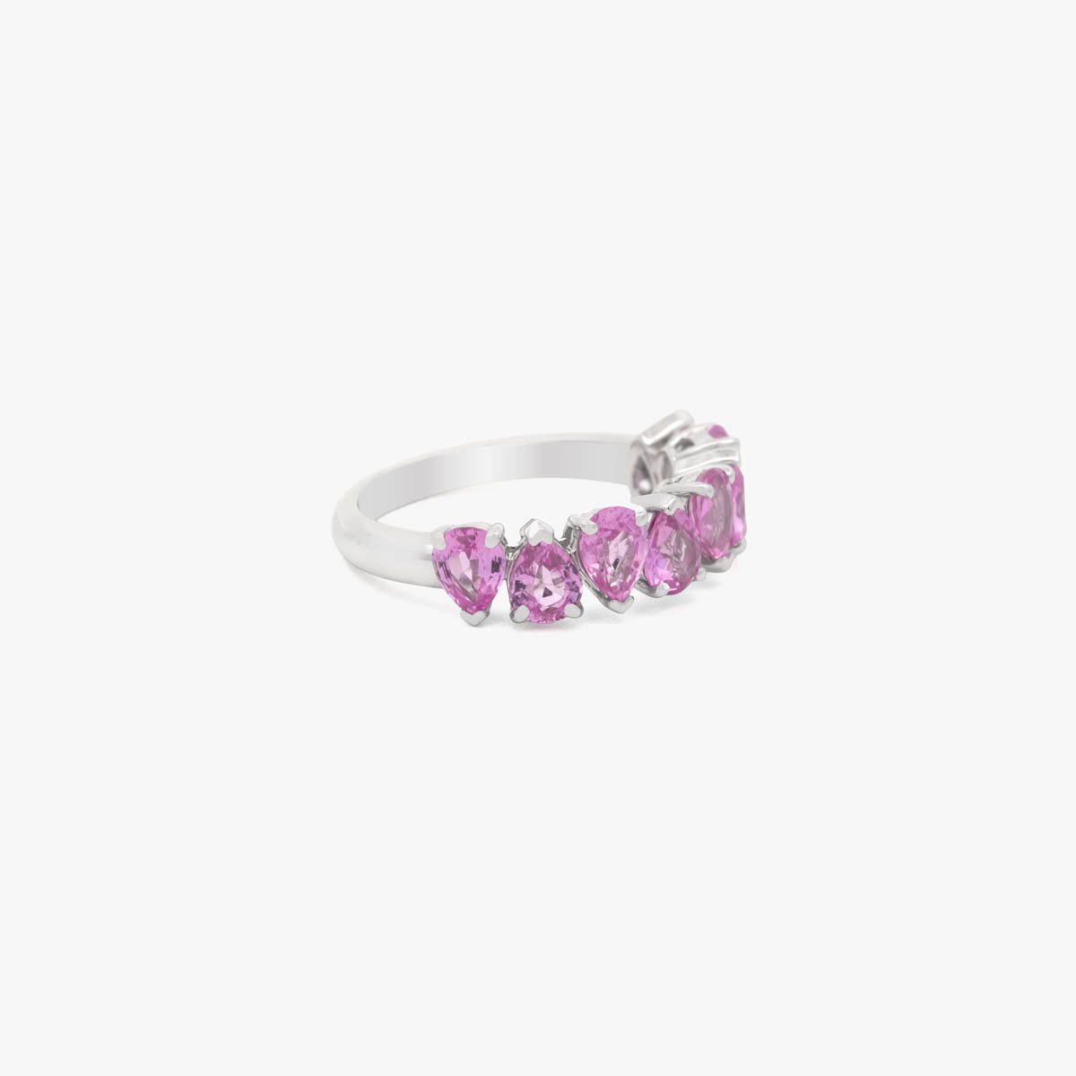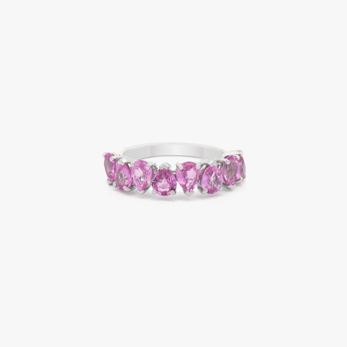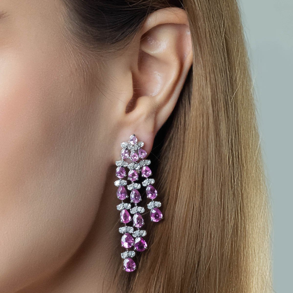 Three delicate rows of pink sapphires flow seamlessly across the necklace and earrings, creating soft, feminine, and sophisticated elegance.