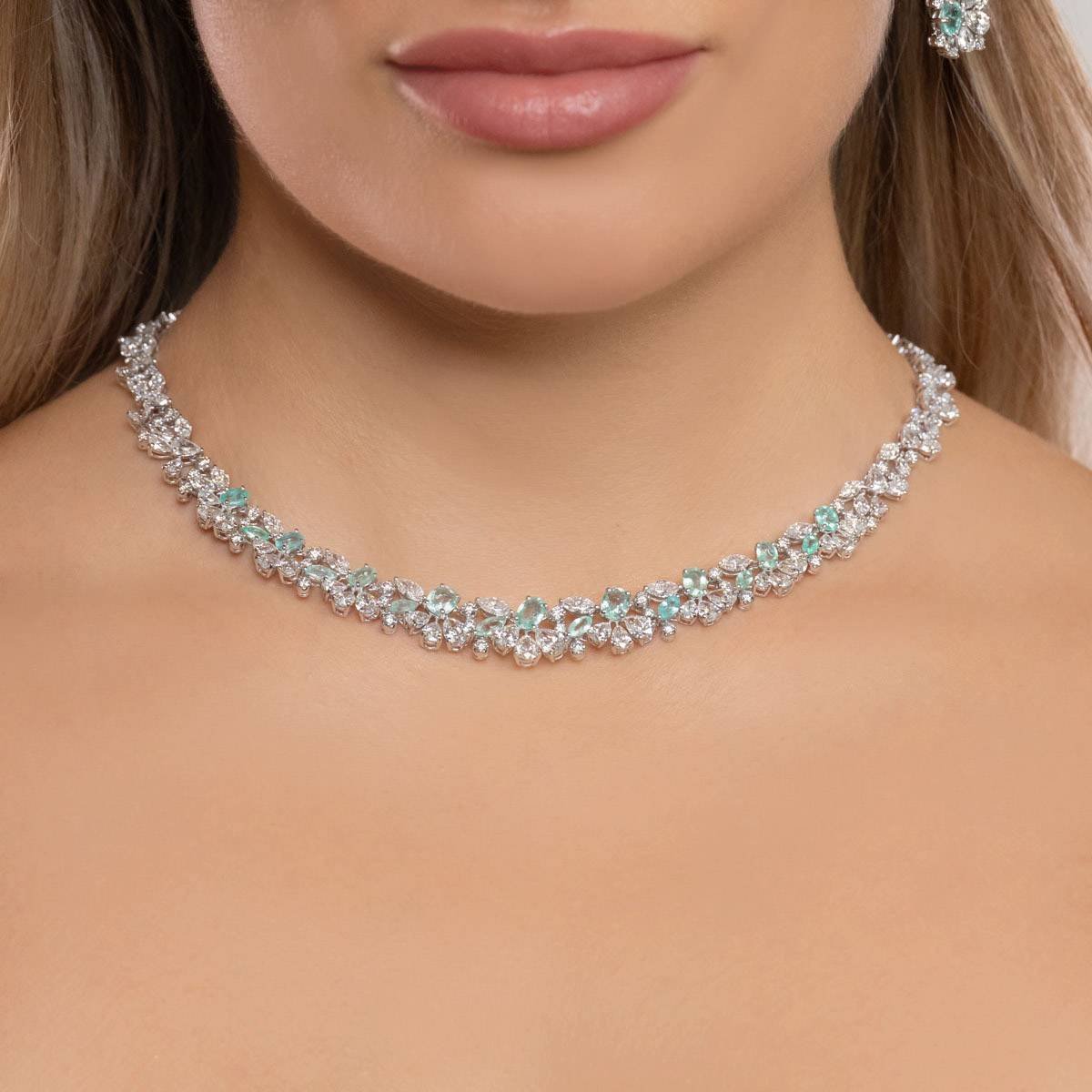 A unique set featuring the captivating blue-green hue of Paraiba tourmaline gemstones paired with white diamonds. Each diamond above 0.3 carats is GIA Certified, ensuring top-notch quality and brilliance. F, G, and H colors with VS+ clarity.