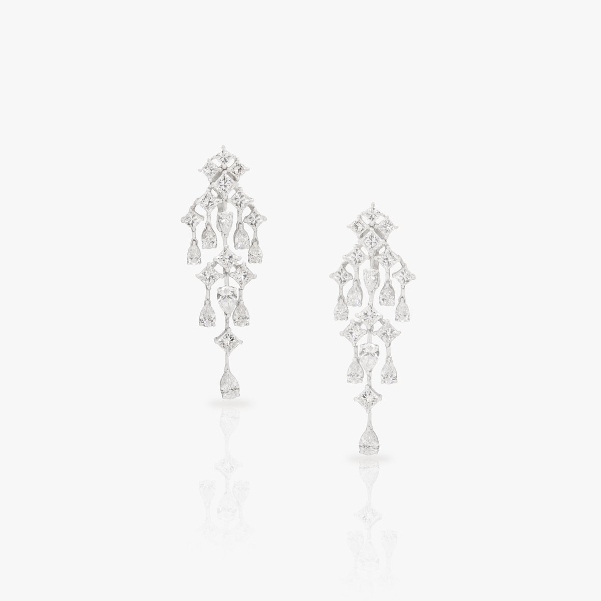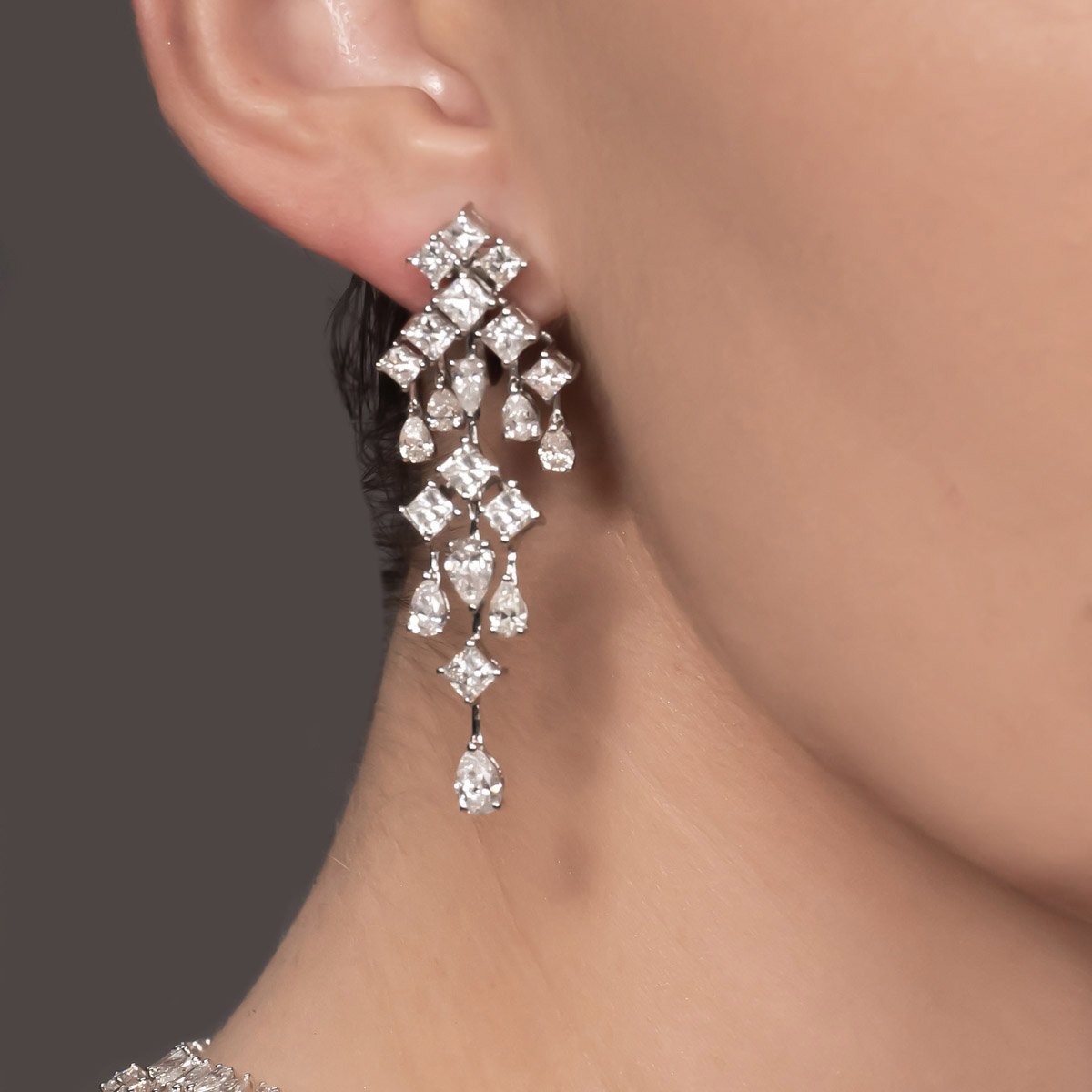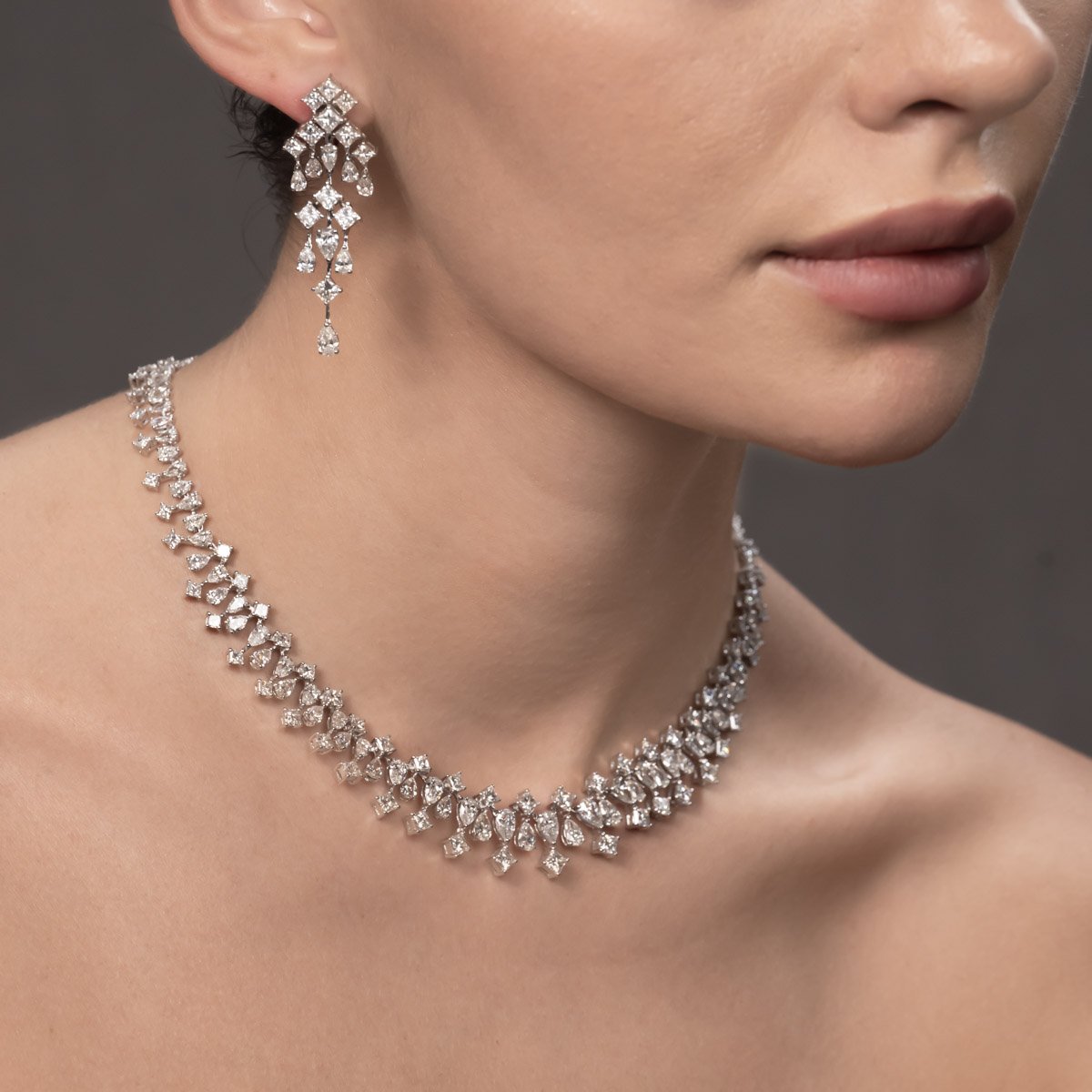An exquisite set featuring pear and princess-cut diamonds. This set includes a necklace, earrings, and a ring, all showcasing fine-quality natural diamonds. Each diamond above 0.3 carats is GIA Certified, offering unmatched brilliance and quality. F, G, and H colors with VS+ clarity.