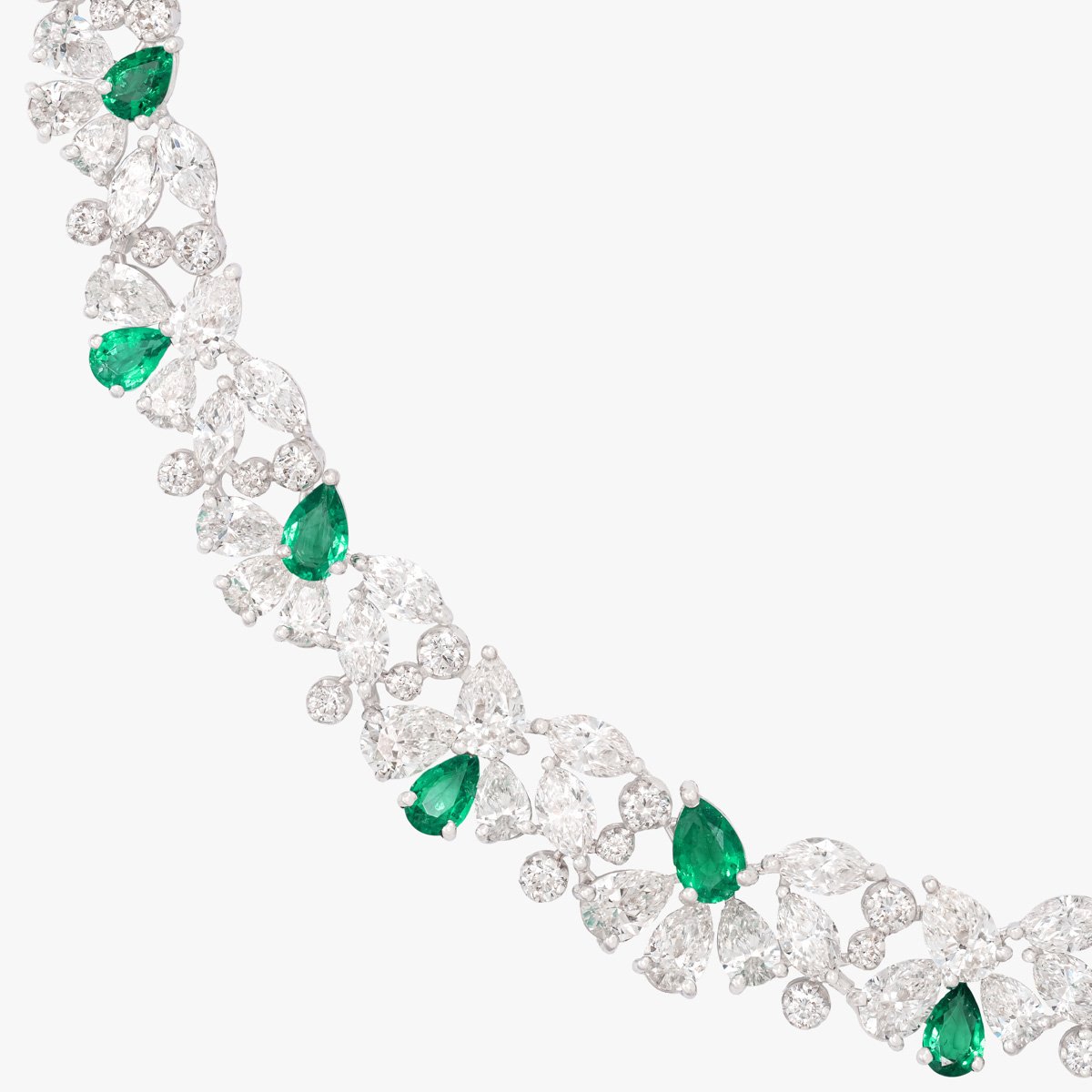 A captivating necklace adorned with green emerald-colored gemstones and white diamonds. This elegant piece features fine-quality natural diamonds, each above 0.3 carats and GIA Certified. F, G, and H colors with VS+ clarity.