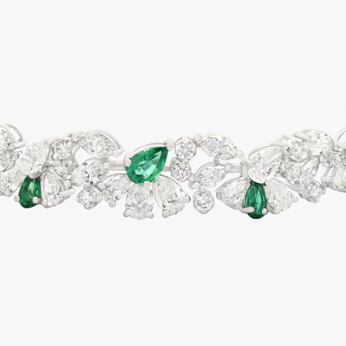 A bracelet adorned with green emerald-colored gemstones and white diamonds. This elegant piece features fine-quality natural diamonds, each above 0.3 carats and GIA Certified. F, G, and H colors with VS+ clarity.